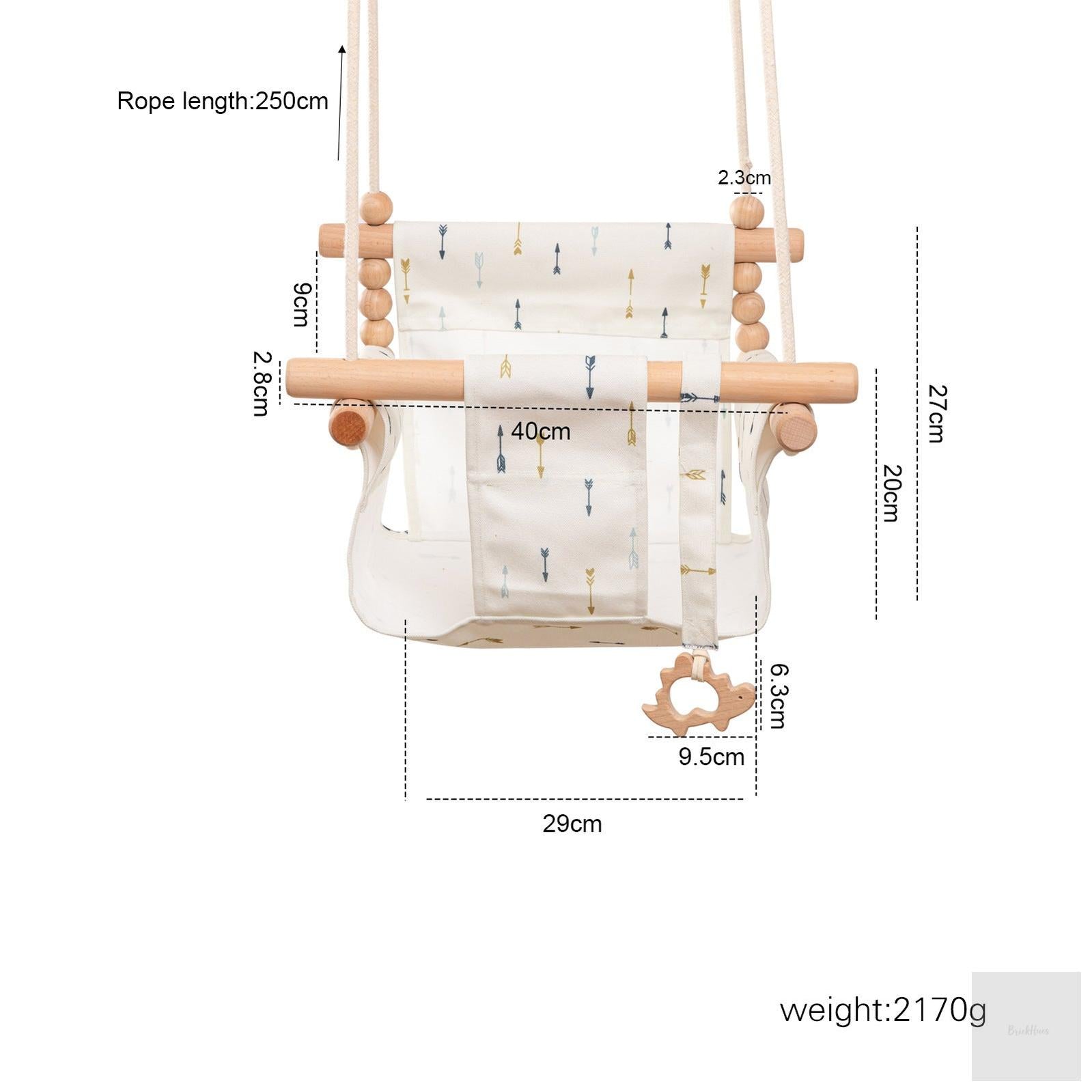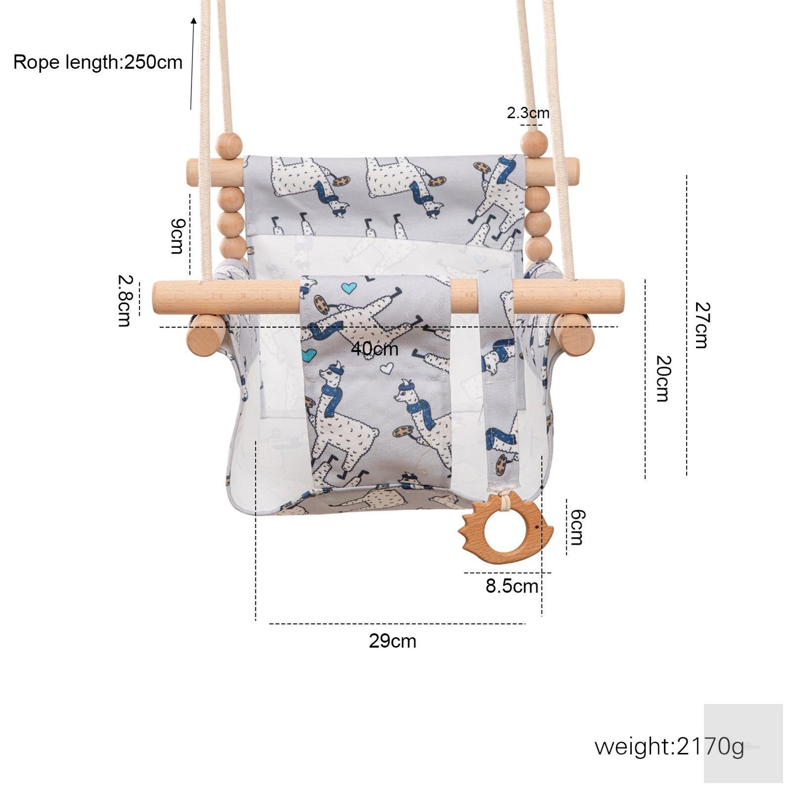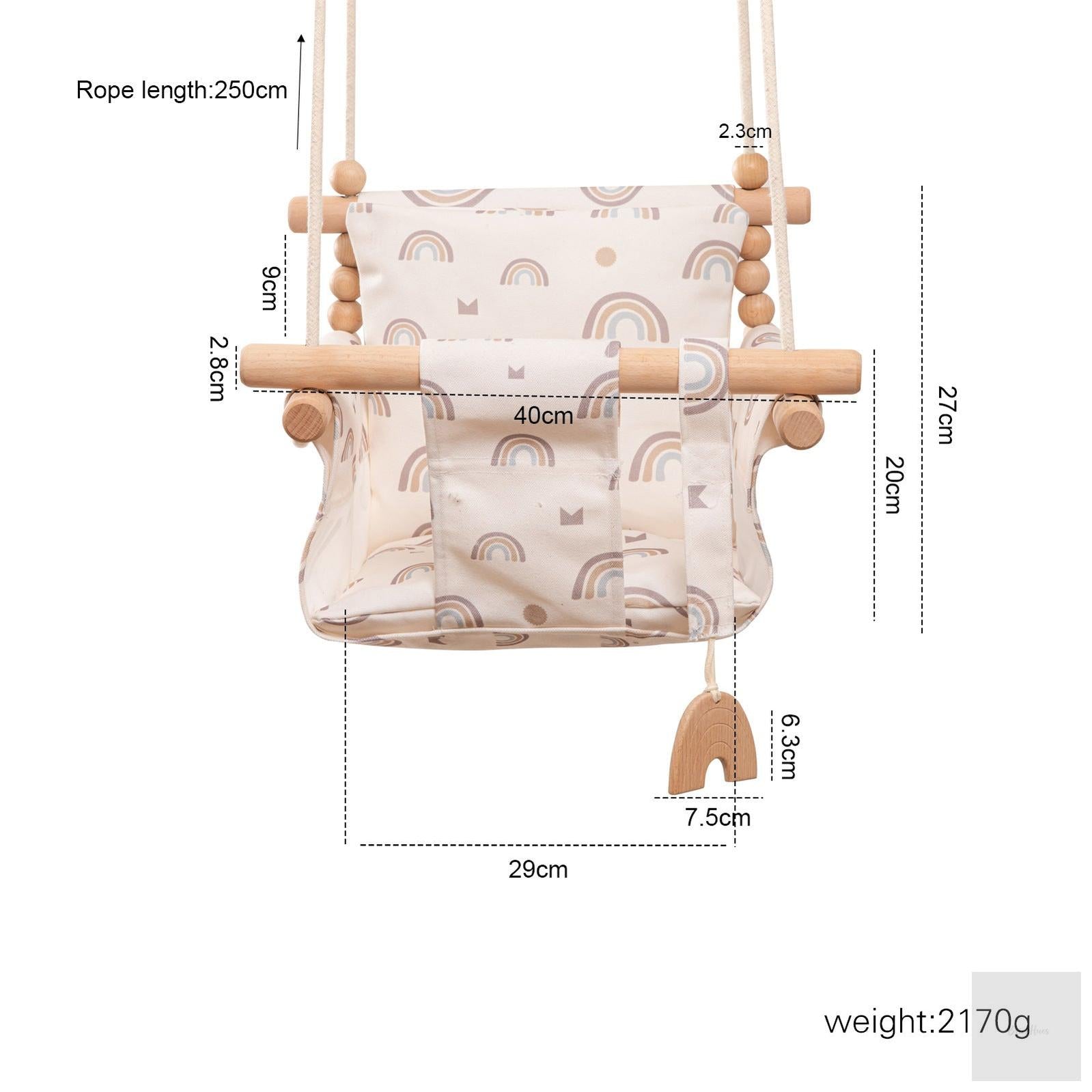 Available in four beautiful designs — Orange, Rainbow, Arrow, and Alpaca —, this swing doubles as a decorative centerpiece for nurseries, playrooms, or living areas. Its sturdy wooden frame ensures long-lasting stability, while the comfortable cloth seat provides gentle support and security for little adventurers.