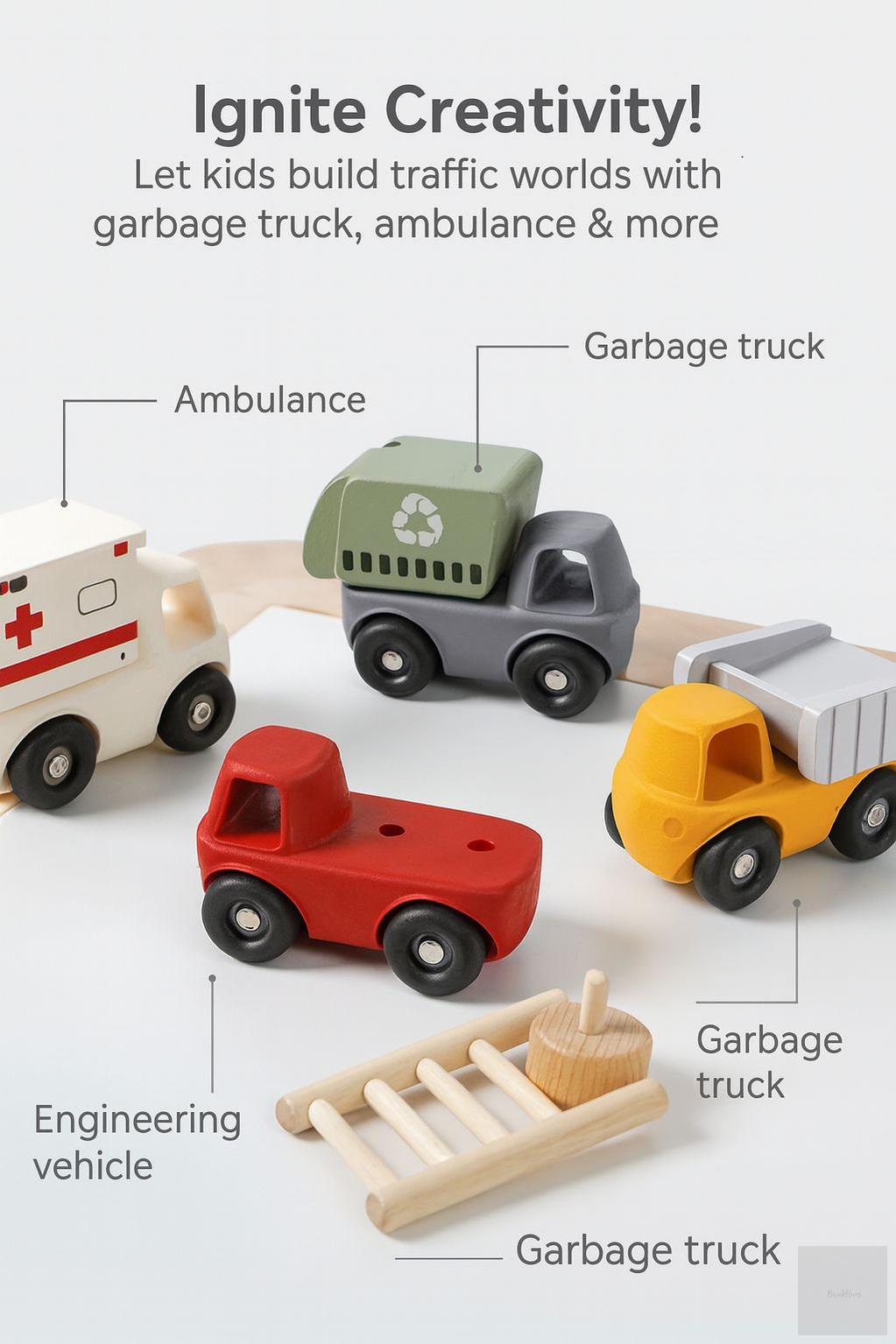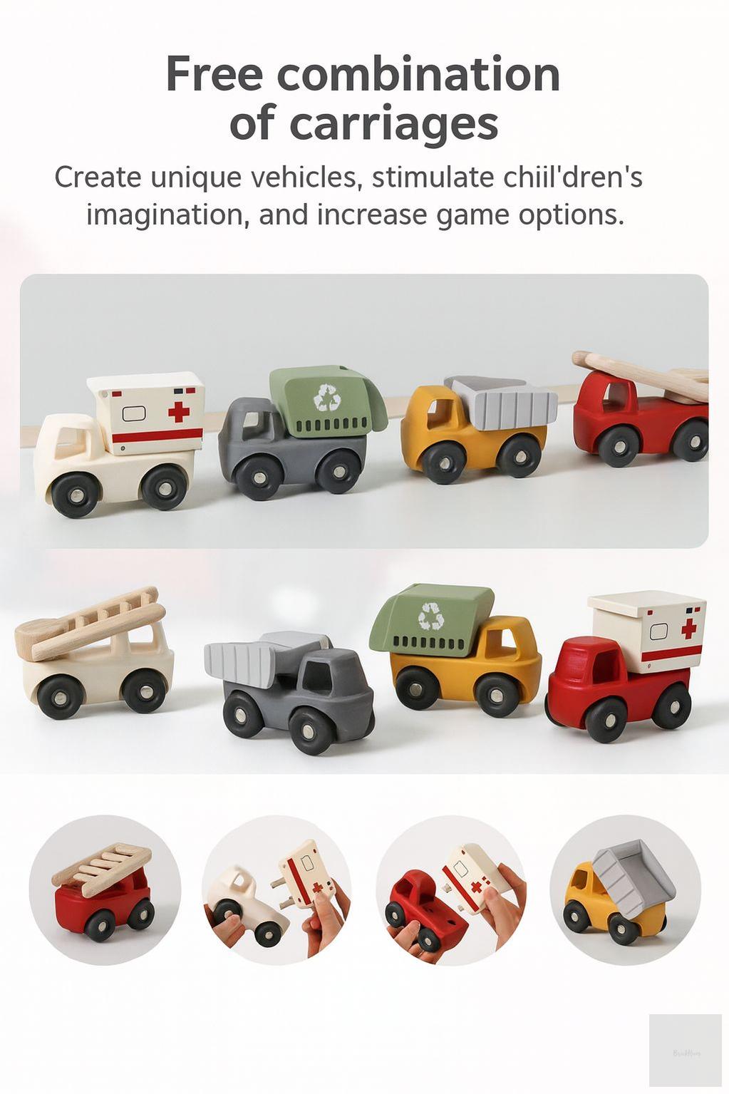 Discover endless play possibilities with the Brick Hues Montessori Wooden & Silicone Car Set, a 4-in-1 vehicle collection designed to spark creativity, learning, and joy in toddlers. This innovative set includes a garbage truck, ambulance, dump truck, and fire engine, each crafted with durable wooden bases and interchangeable food-grade silicone tops that let kids mix, match, and build their own unique vehicles.