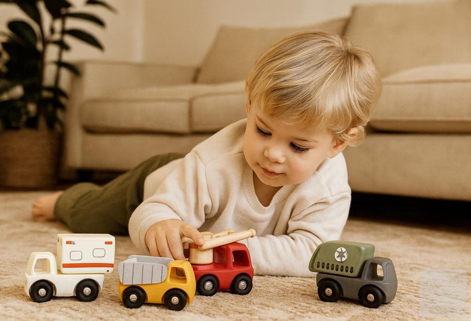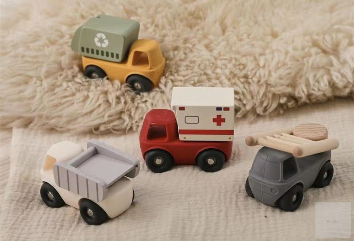 4-in-1 Montessori Vehicle Set – Garbage truck, ambulance, dump truck & fire engine.