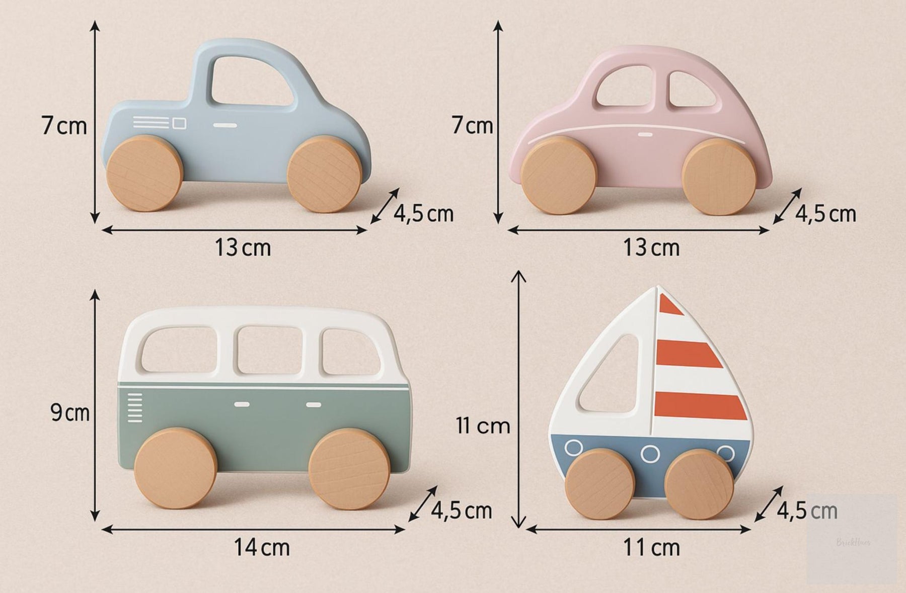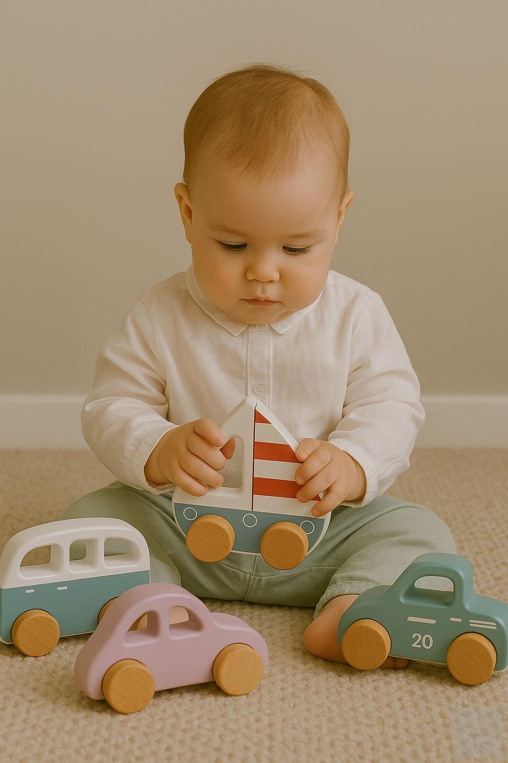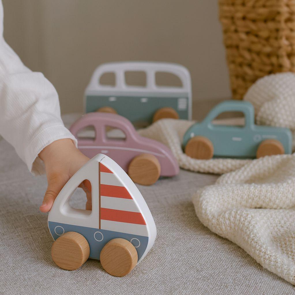 ✅ 4-in-1 Montessori Vehicle Set – Includes pickup, beetle car, van & sailboat.