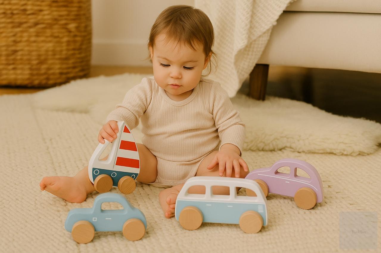 Bring playtime to life with the Brick Hues Montessori Wooden Car & Boat Set, a beautifully crafted 4-in-1 wooden vehicle collection designed for toddlers and preschoolers. Featuring a blue pickup truck, pink beetle car, classic green van, and a colorful sailboat, each toy is thoughtfully sized for little hands (7–11 cm height, 11–14 cm length) and made from eco-friendly, non-toxic wood with smooth edges for safe play.